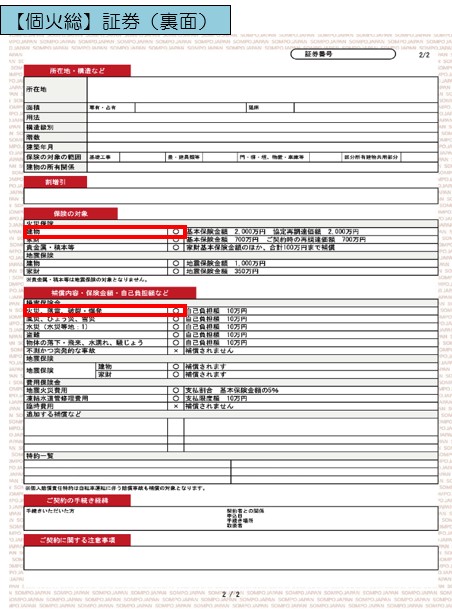 保険証券でご確認いただく場合は、以下サンプル画像の赤枠部分に〇がある場合に補償の対象となりますのでご参考にしてください。