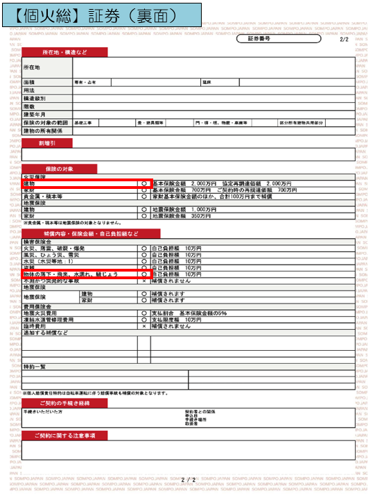 保険証券でご確認いただく場合は、以下サンプル画像の赤枠部分に〇がある場合に補償の対象となりますのでご参考にしてください。