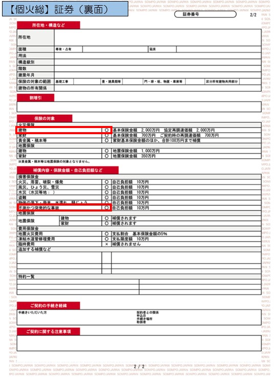 保険証券でご確認いただく場合は、以下サンプル画像の赤枠部分に〇がある場合に補償の対象となりますのでご参考にしてください。
