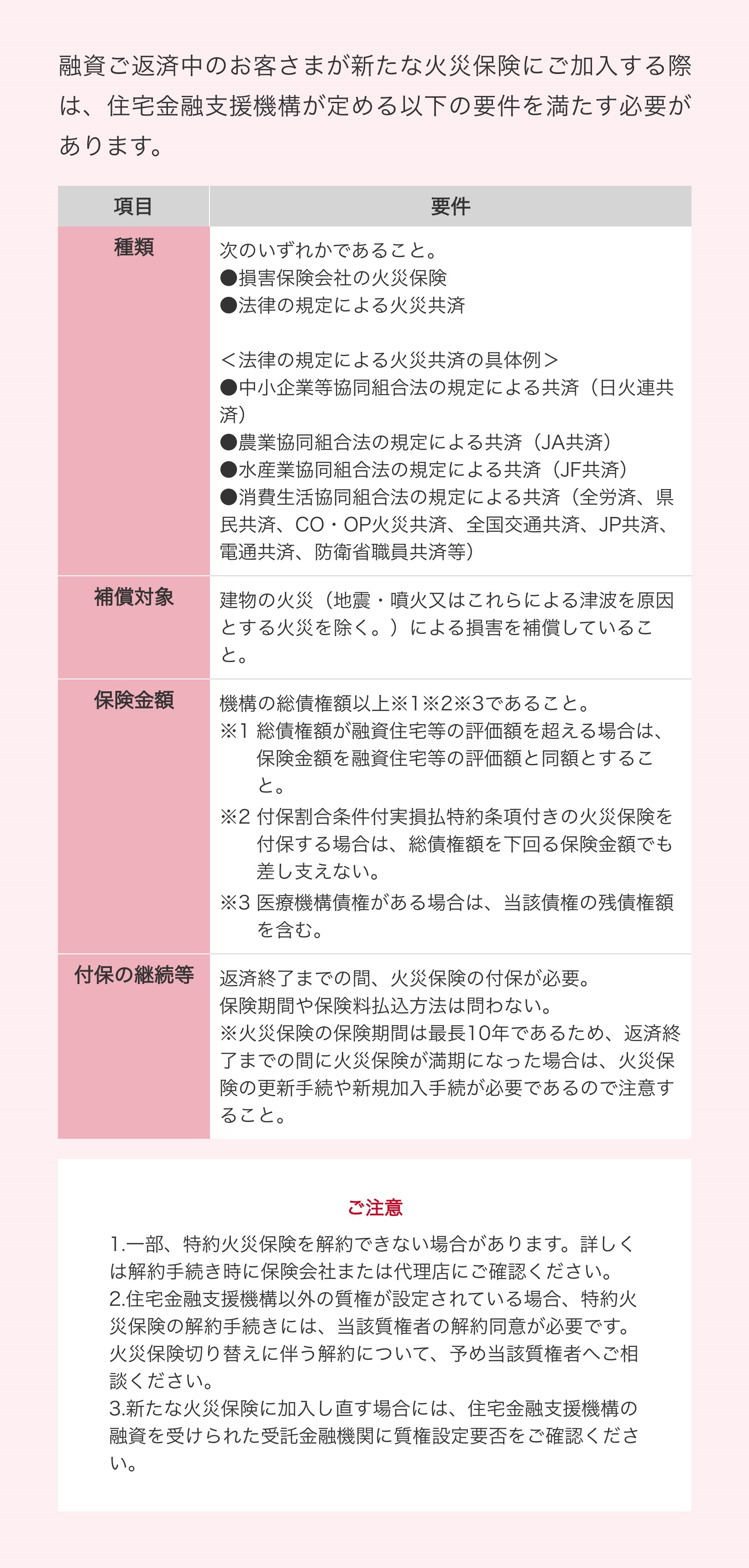 住宅金融支援機構(以下「機構」)の融資の返済が完了するまでは、融資住宅等に以下のいずれかの保険の契約をする必要があります。